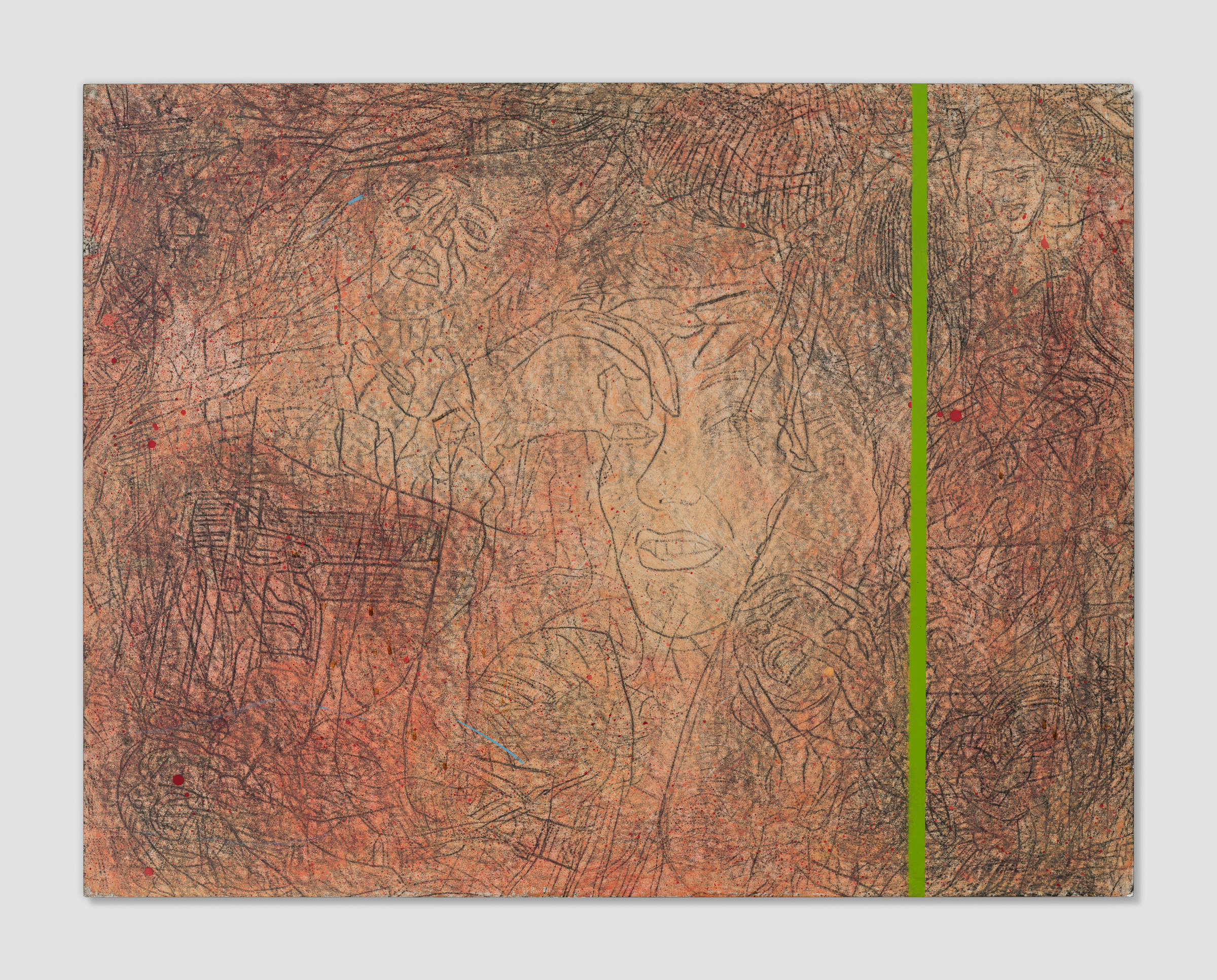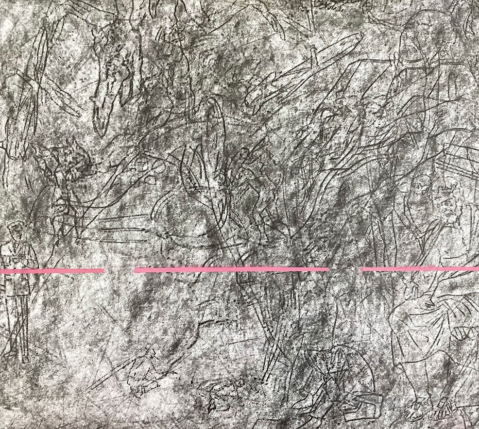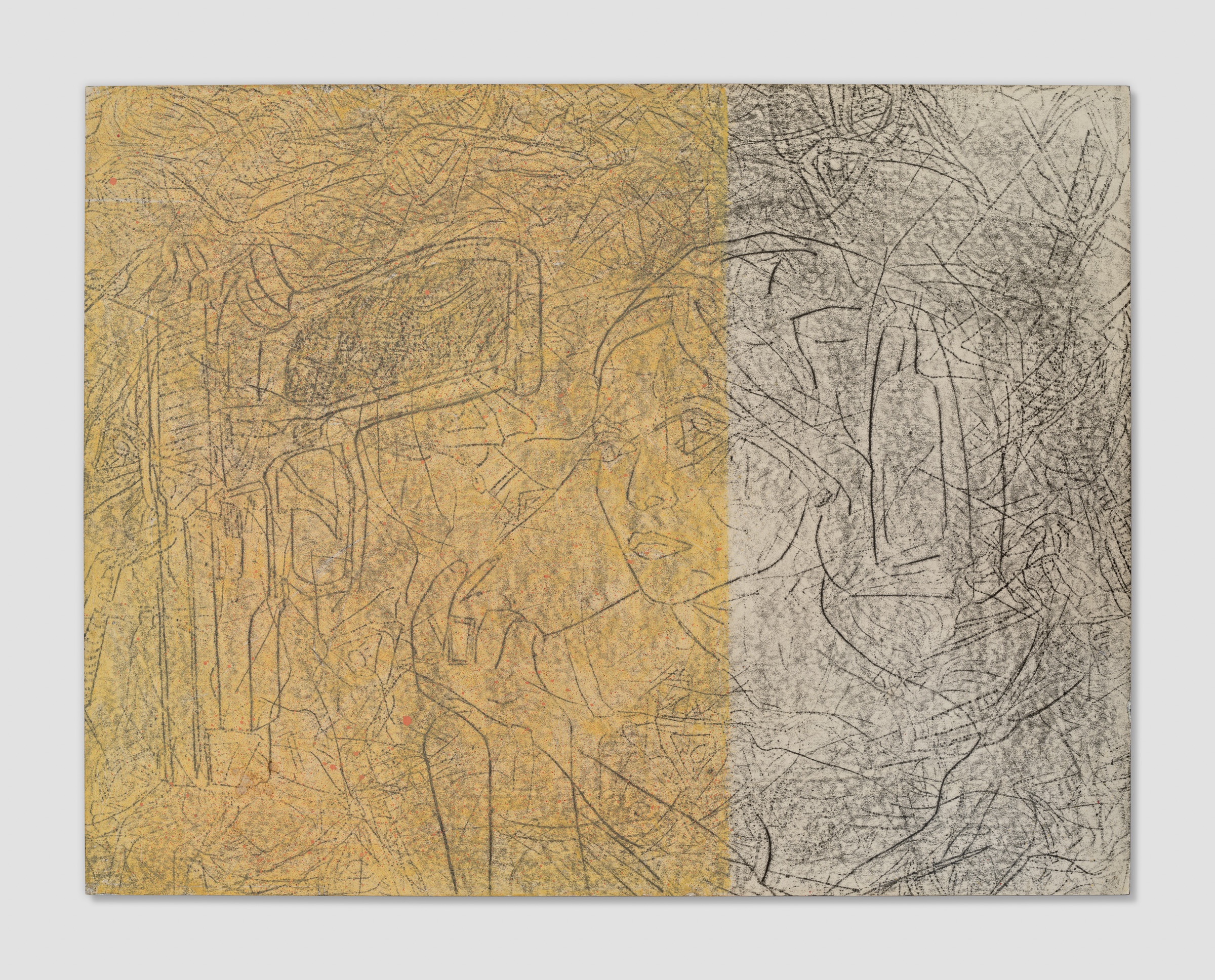 The exhibited works disrupt the autonomy of drawing, photography, and painting, reflecting No Wave’s broader resistance to medium specificity amid an increasingly commercial art market. The mechanical enlargement process translates the layered accumulations of tracings, quotations, and motifs in Nechvatal’s drawings into homogenized photographic surfaces. Sparse deployments of oil stick and enamel paint function as residual traces of authorship and nods to repressed expression. The primacy of gesture is displaced in favor of a sleekly mediated image field. Partially registered figures, objects, and abstract elements dissolve into indeterminate grounds of gray and beige tonalities.