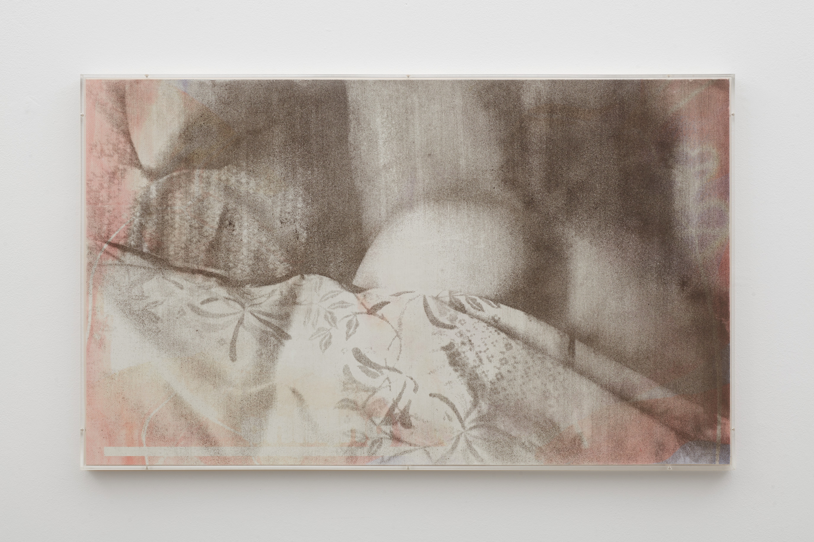 Louis Blue Newby, Untitled (Dust Painting), 2025. Crisco, dust, UV print and oil paint on wooden panel in perspex frame, 24 x 39.75 in. (61 x 101 cm).
