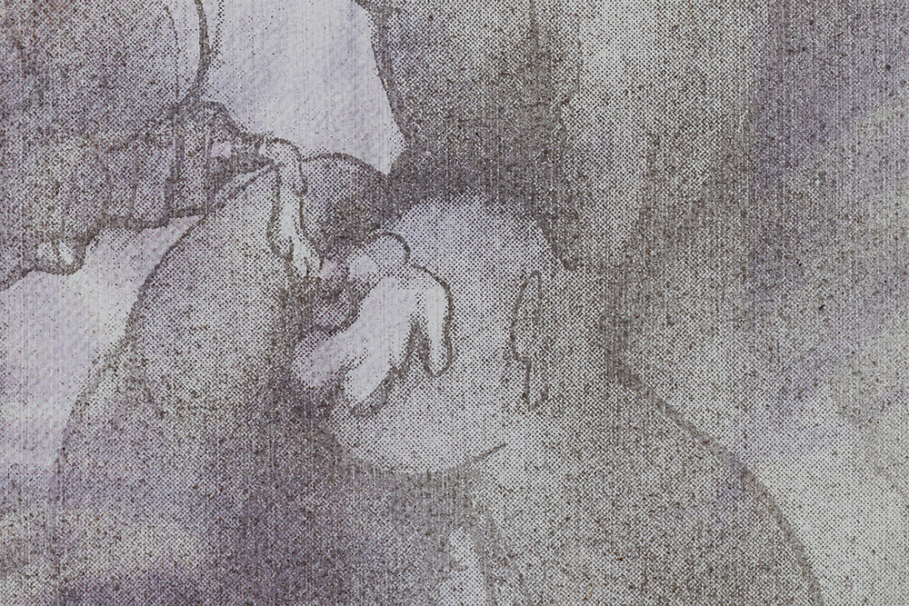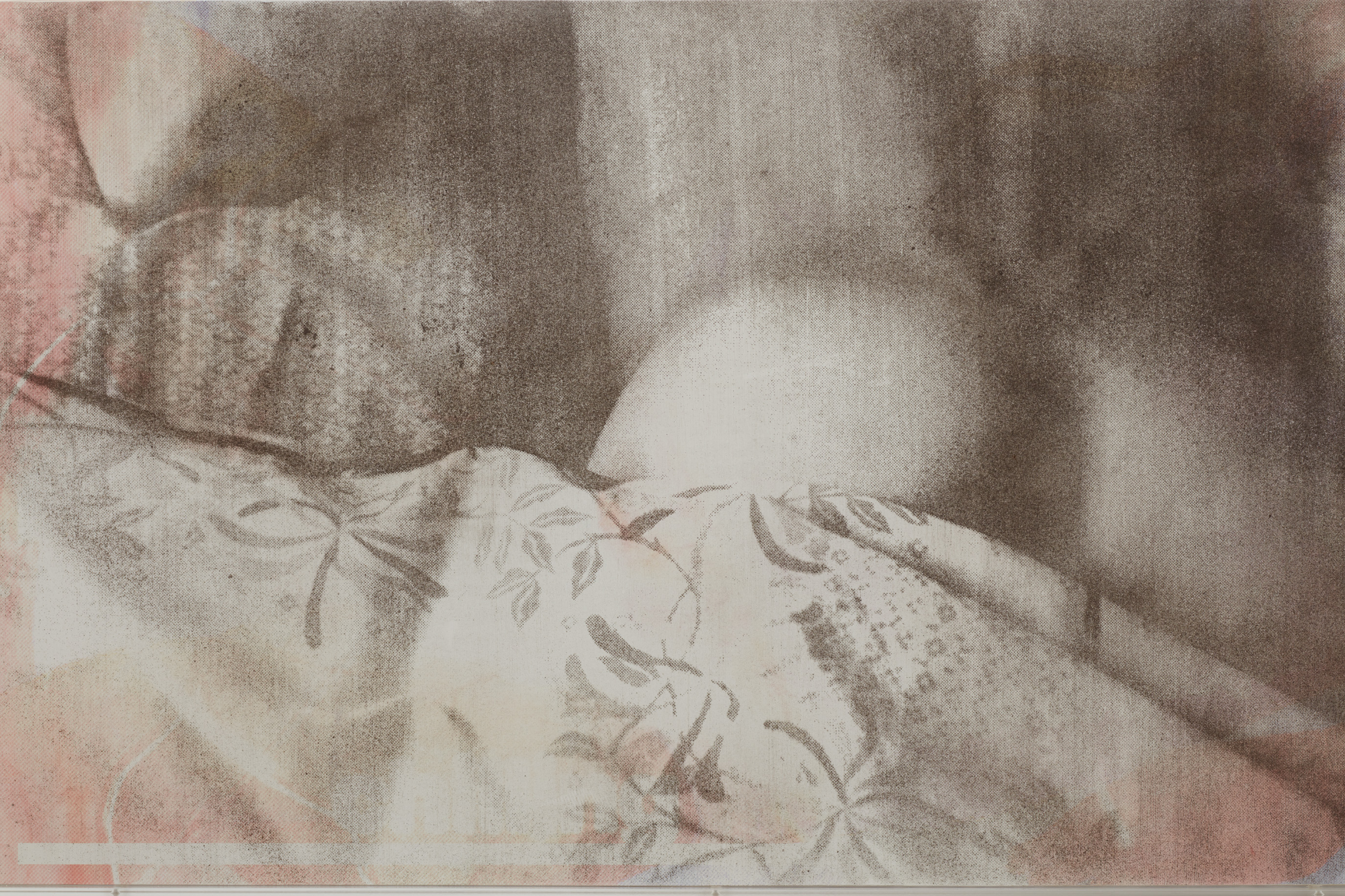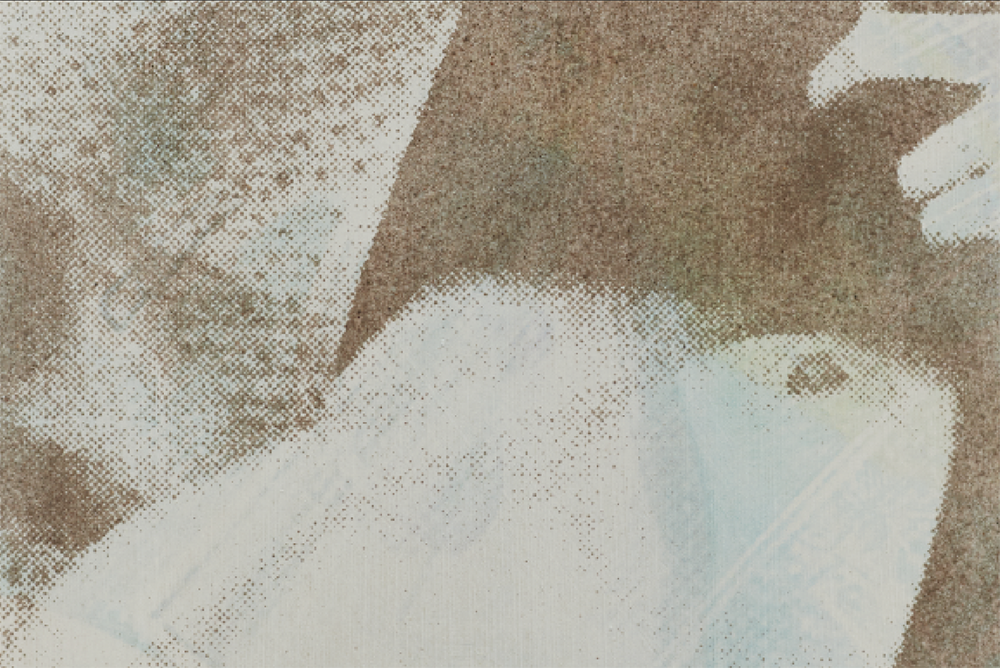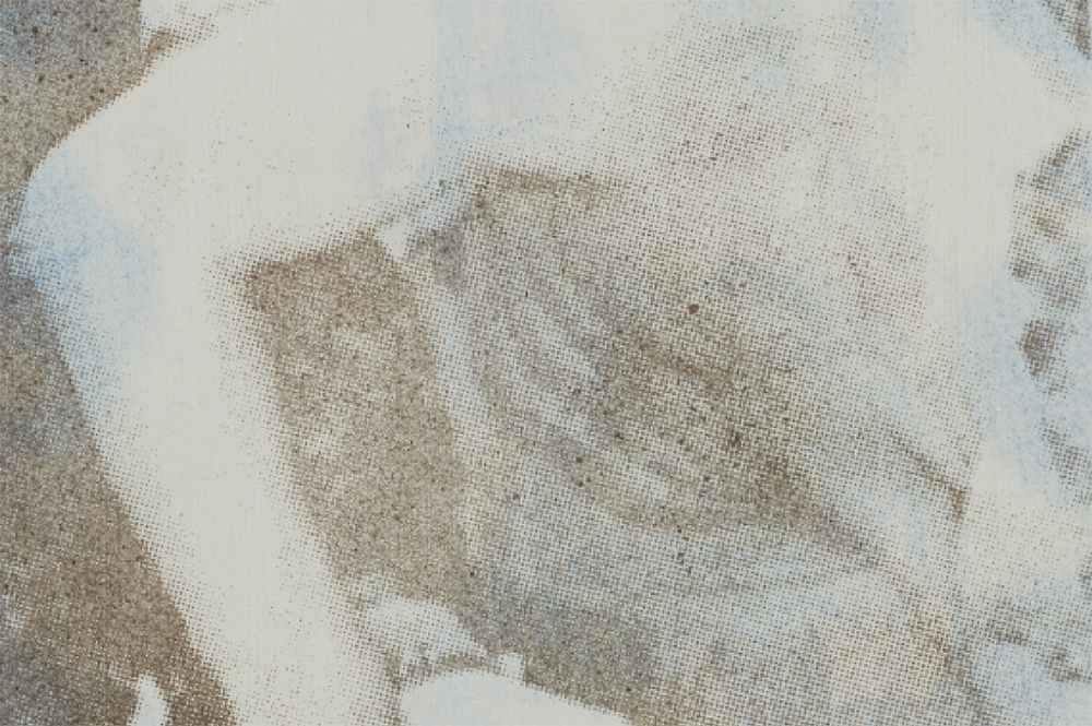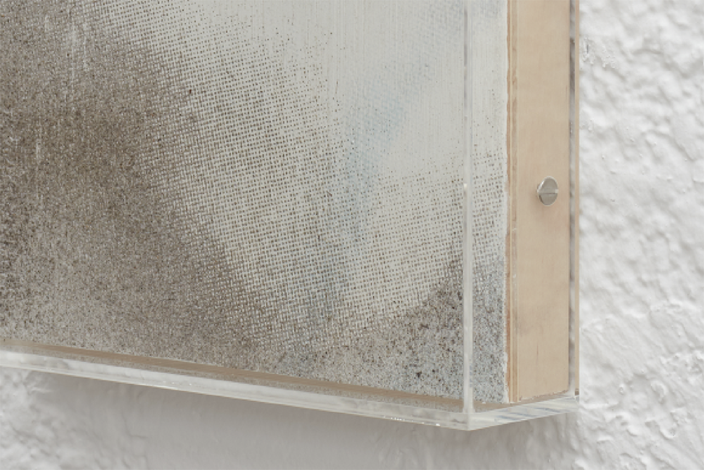 Detail. Louis Blue Newby, Untitled (Dust Painting), 2025. Crisco, dust, UV print and oil paint on wooden panel in perspex frame, 24 x 39.75 in. (61 x 101 cm).