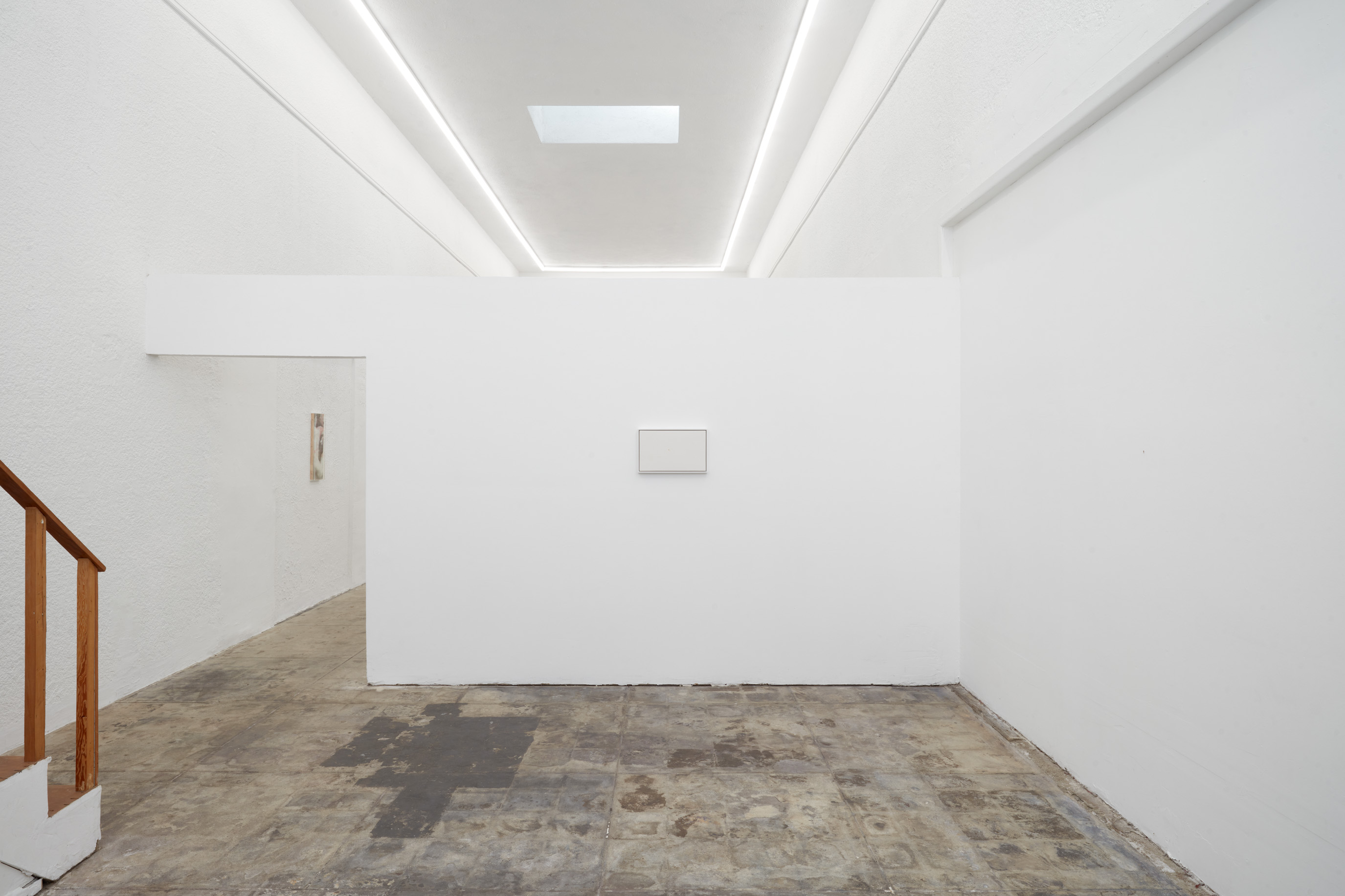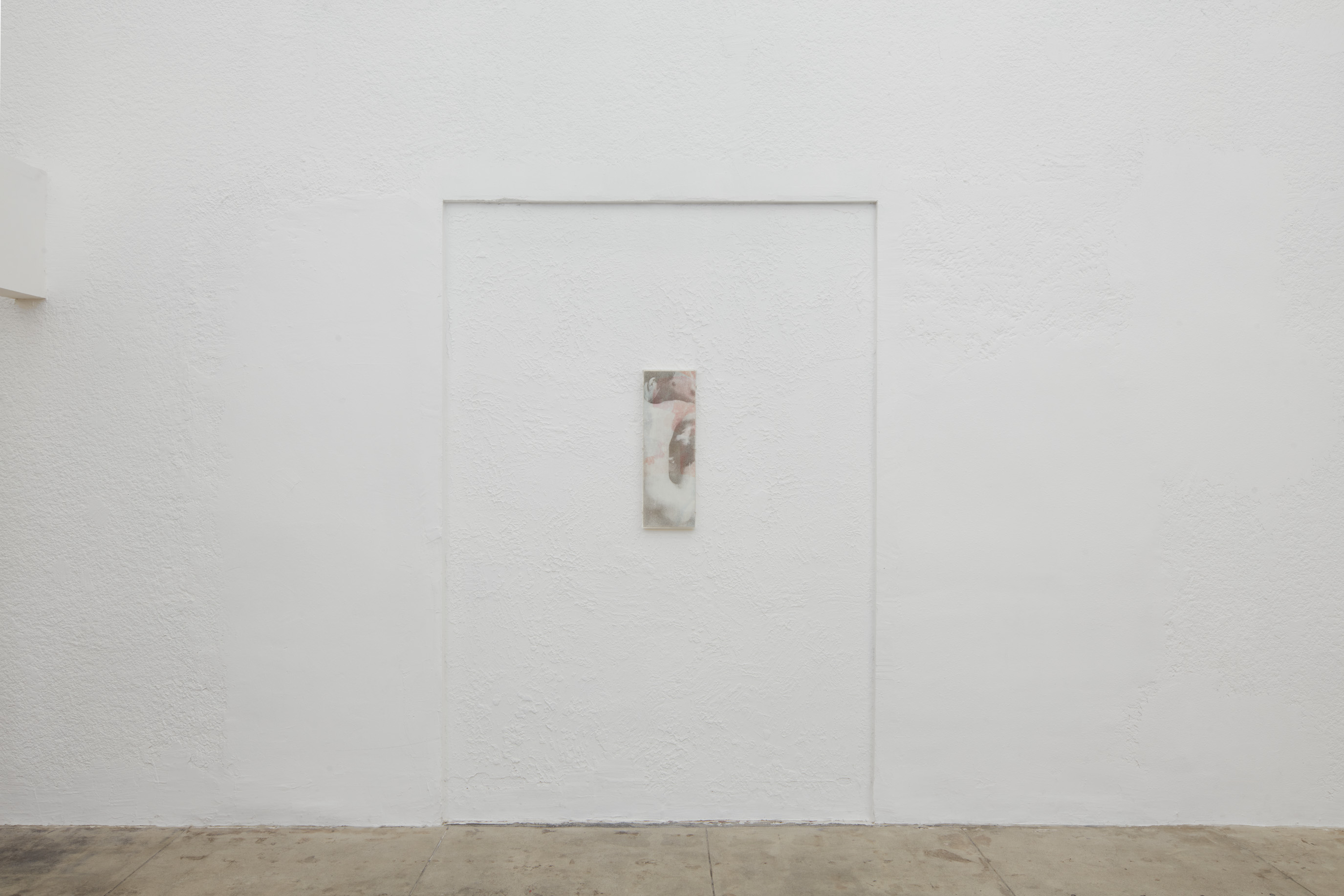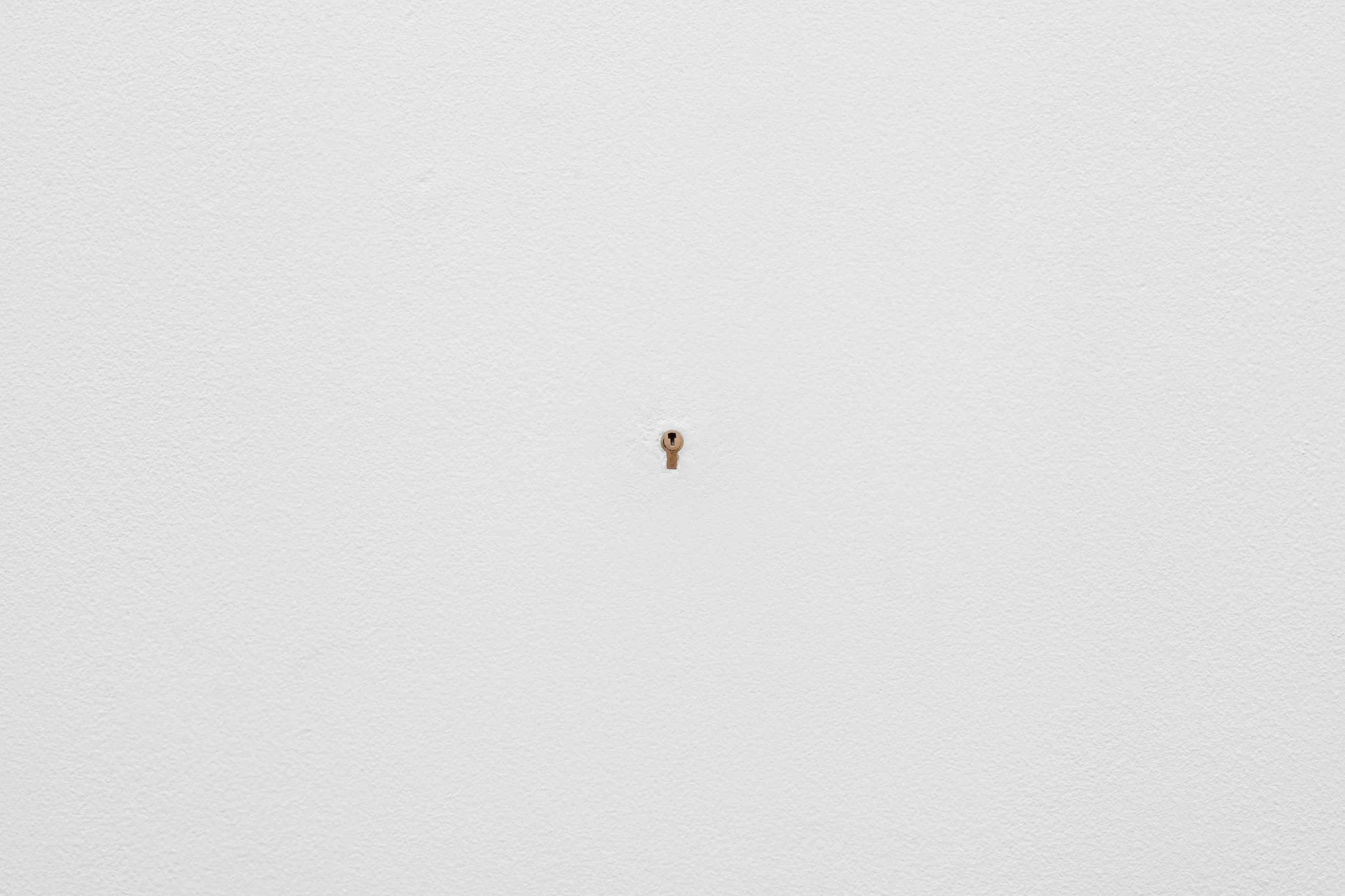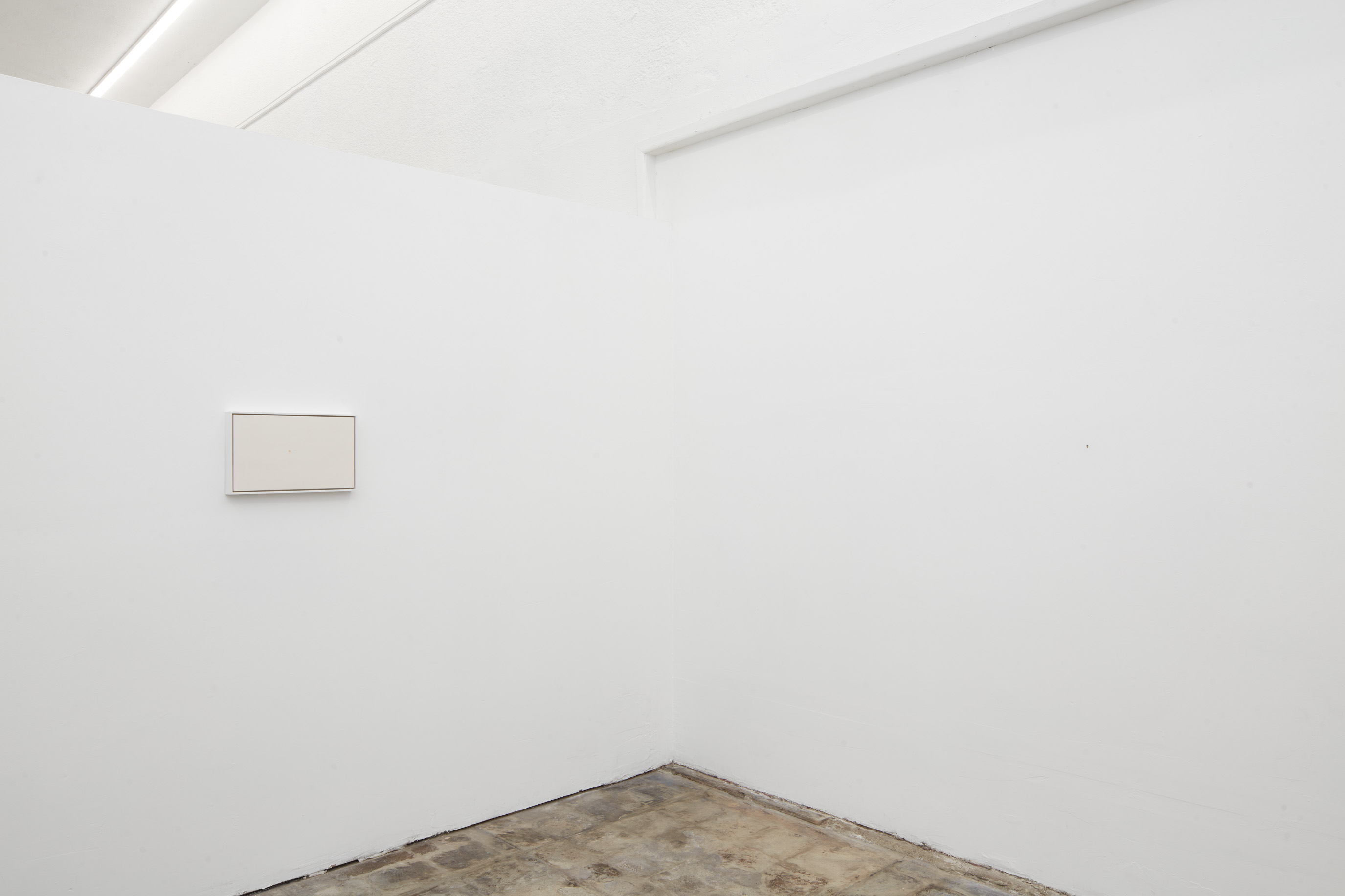 In the back gallery, a framed panel conceals a chastity-cage key beneath multiple layers of gesso, its corresponding lock inset in the wall nearby. The work is made using a traditional gesso recipe consisting of rabbit skin glue, chalk, and marble dust. As the gesso is applied, moisture causes the key to rust which gradually bleeds onto the surface, leaving a faint, bruise-like image.