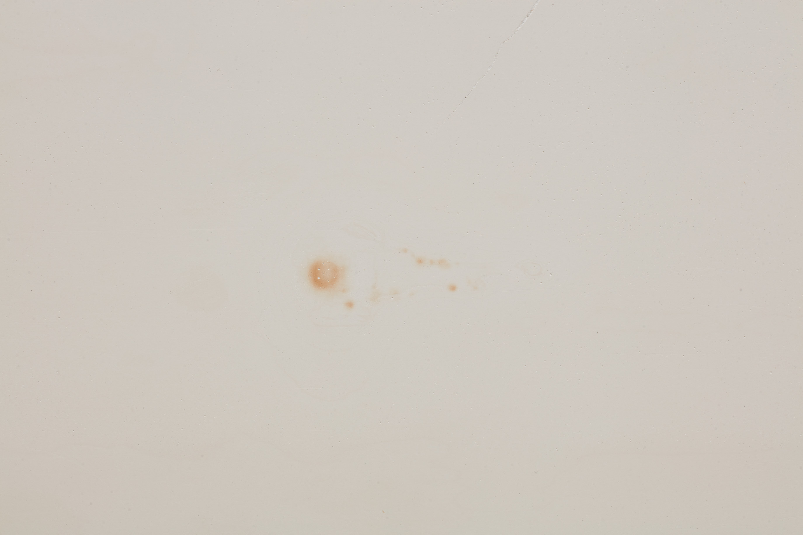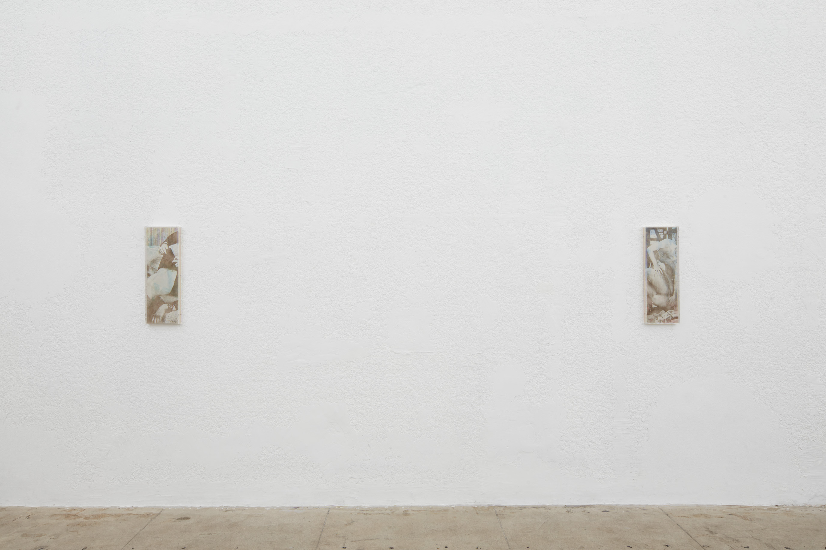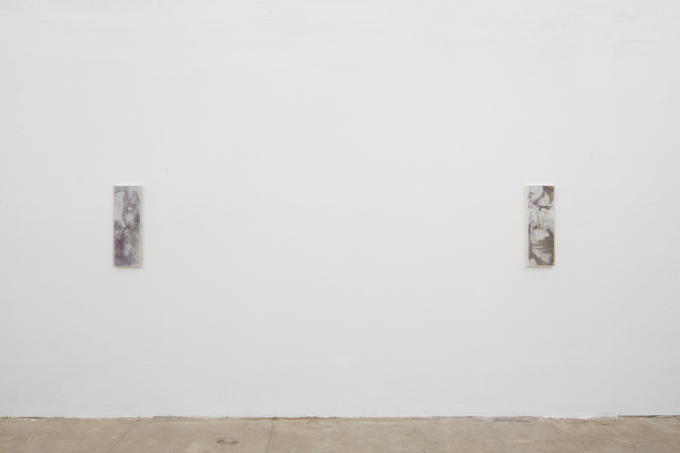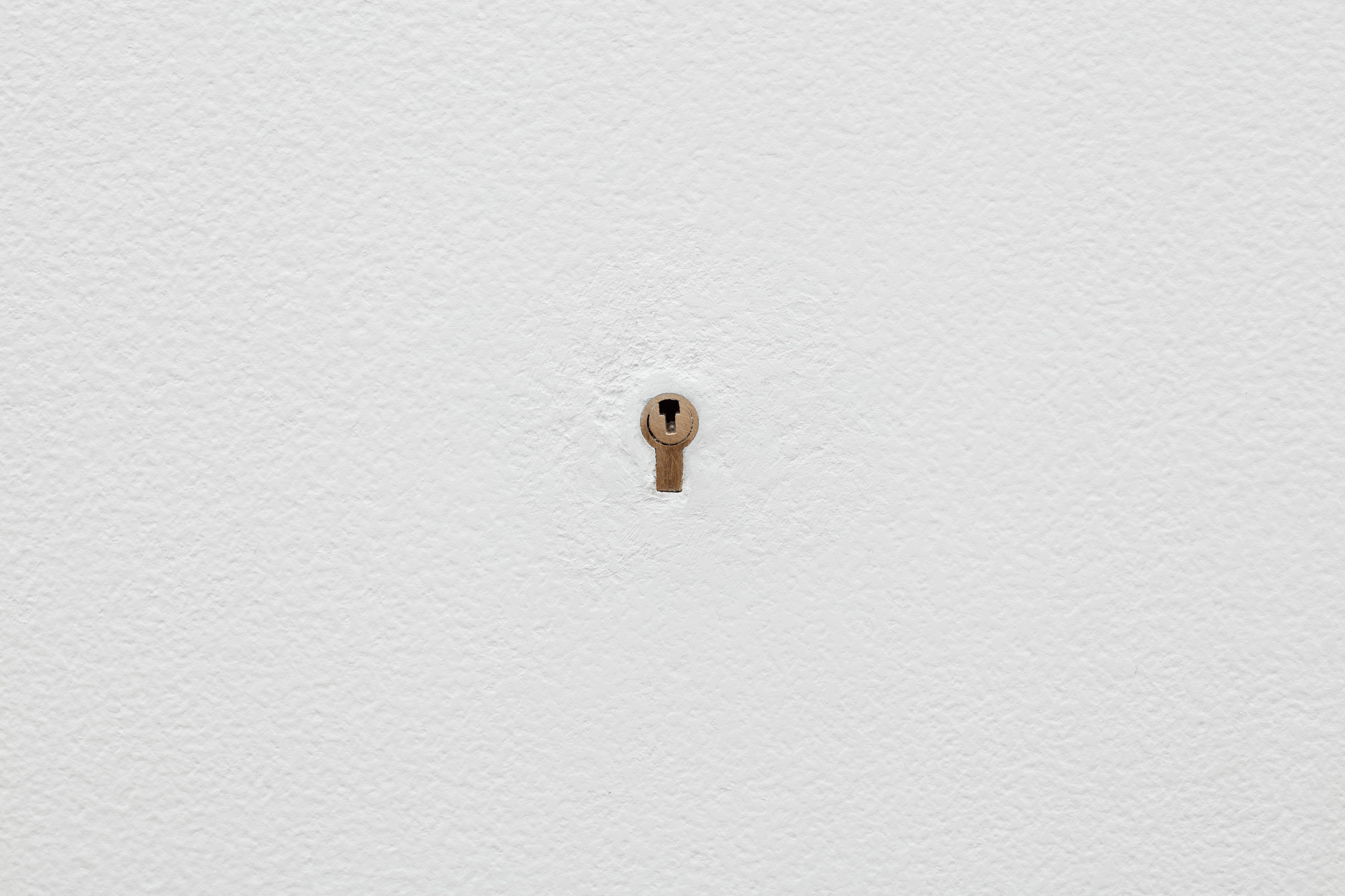 In the back gallery, a framed panel conceals a chastity-cage key beneath multiple layers of gesso, its corresponding lock inset in the wall nearby. The work is made using a traditional gesso recipe consisting of rabbit skin glue, chalk, and marble dust. As the gesso is applied, moisture causes the key to rust which gradually bleeds onto the surface, leaving a faint, bruise-like image.