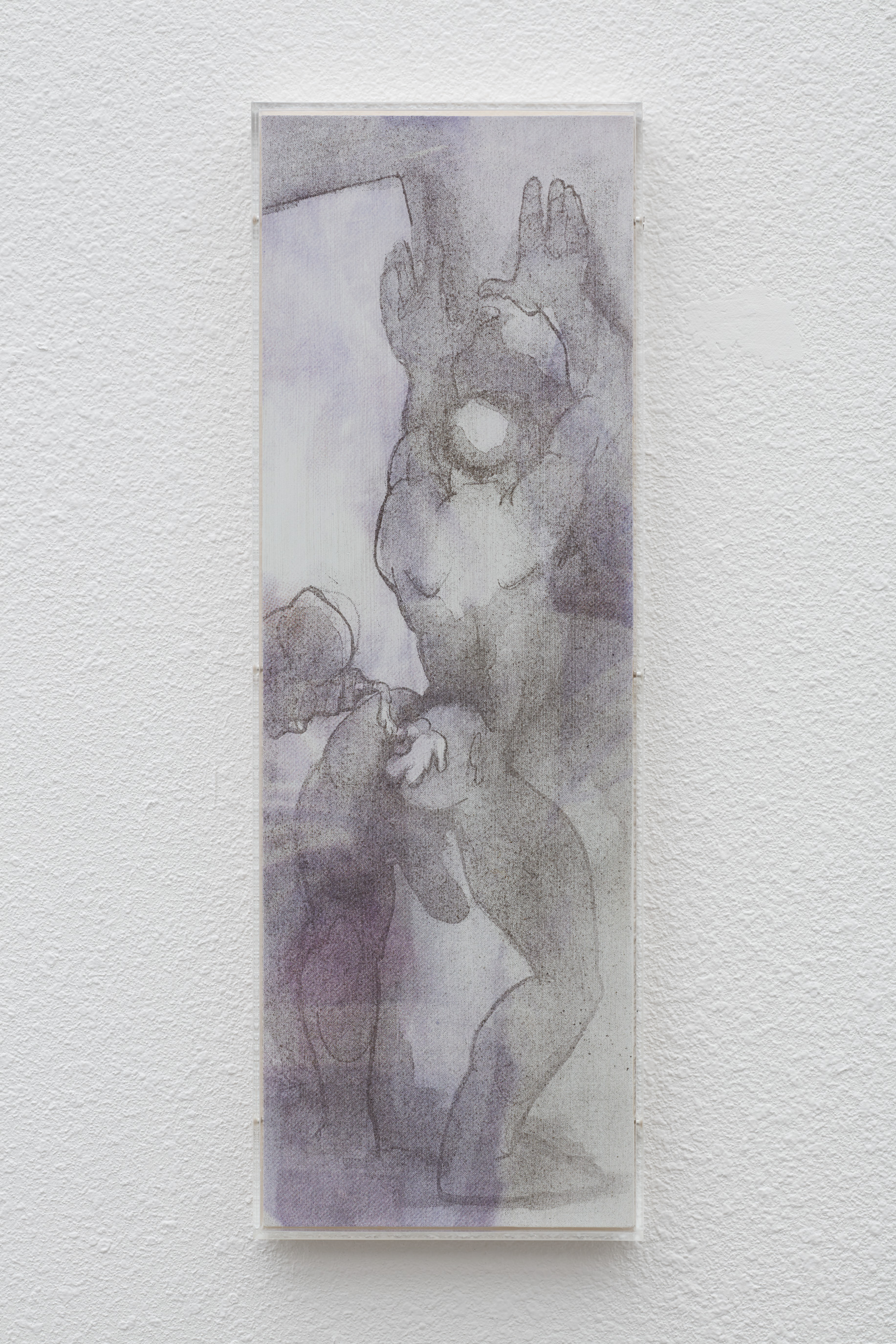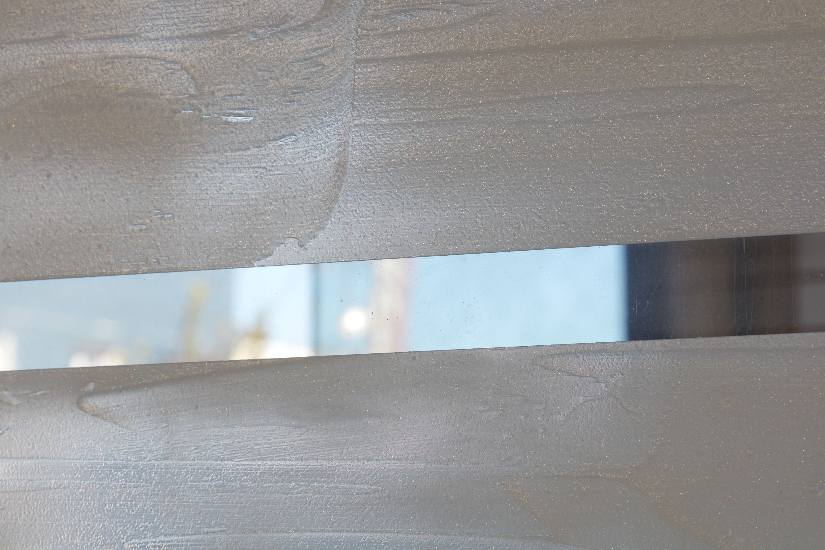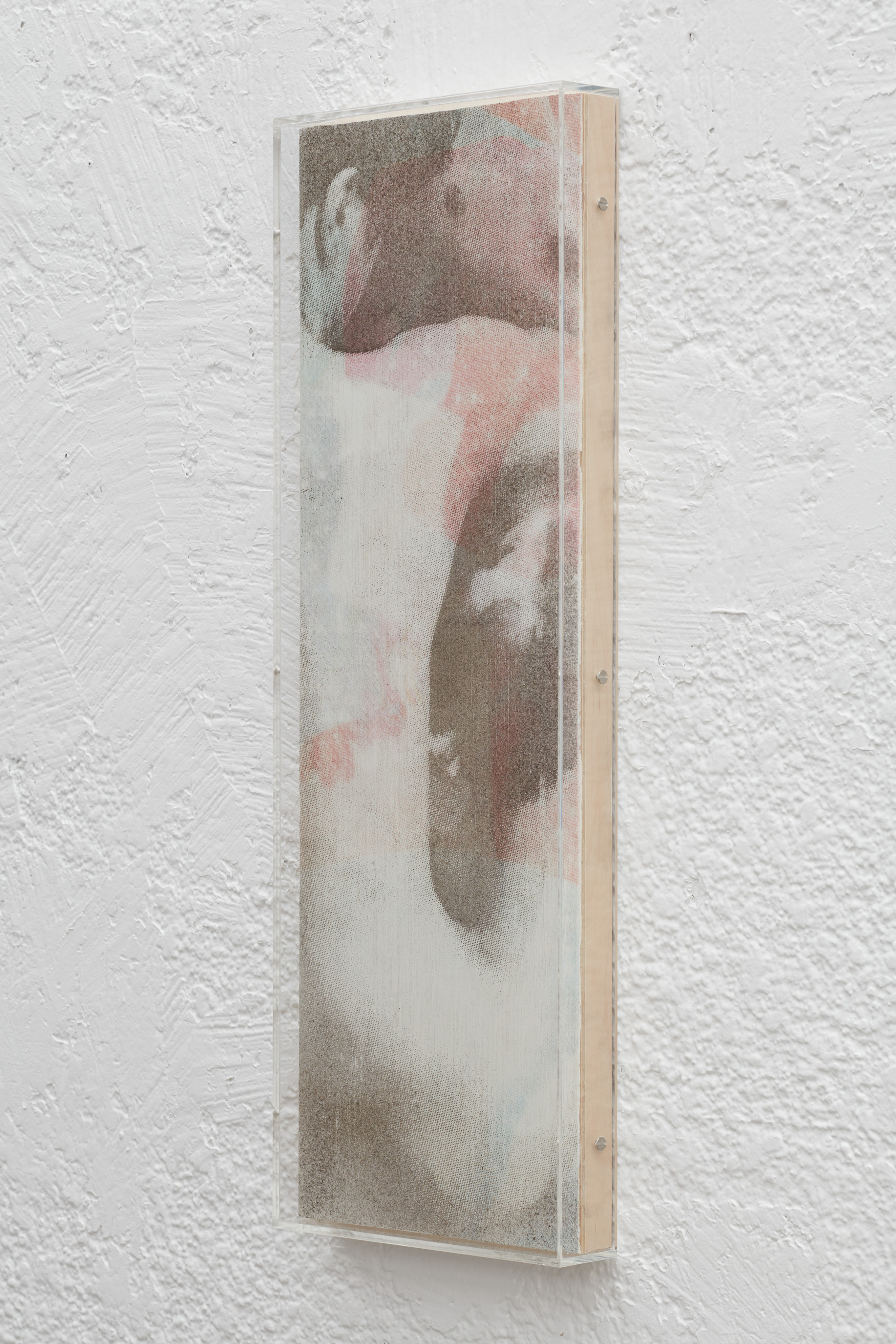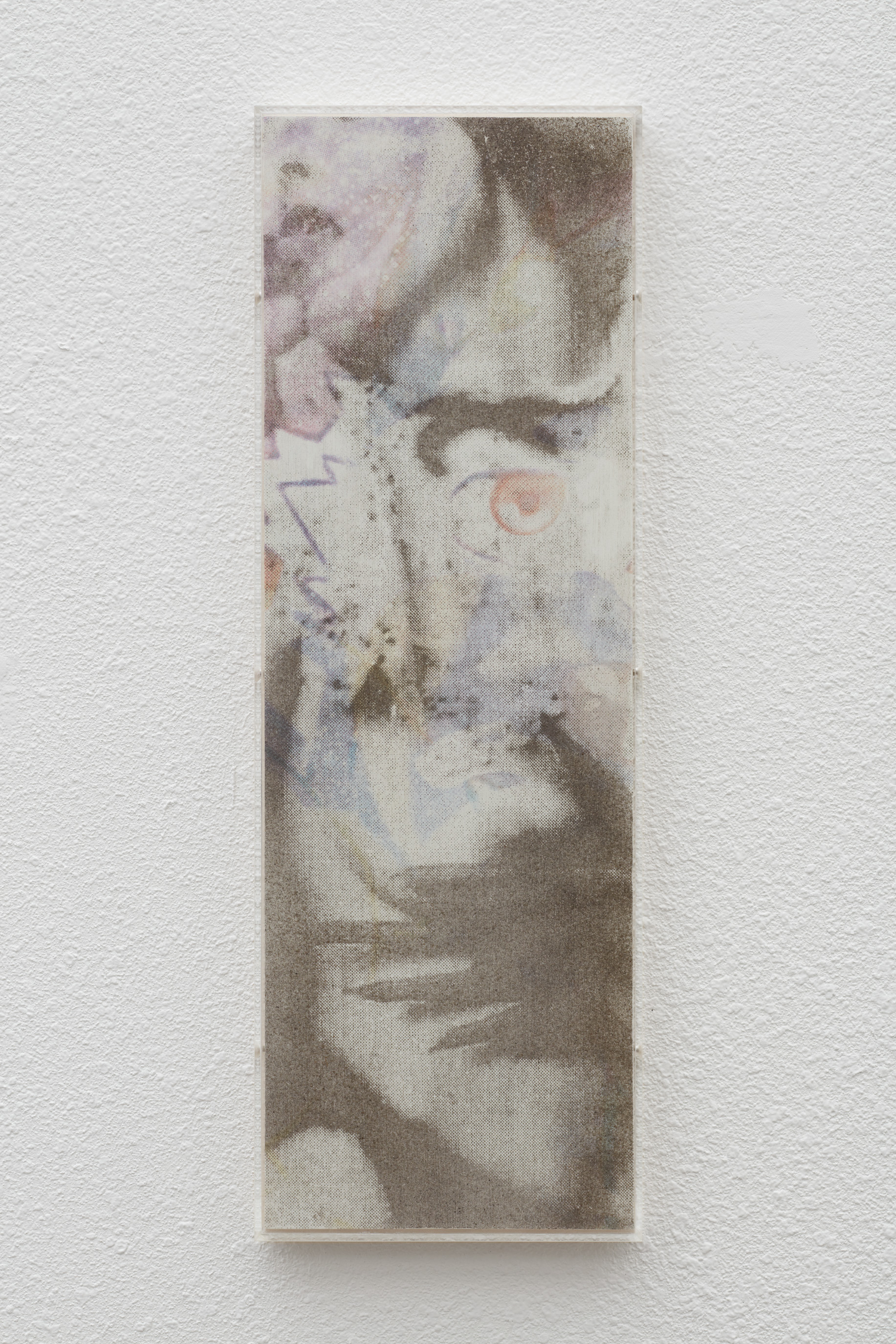 Detail. Louis Blue Newby, Untitled (Dust Painting), 2025. Crisco, dust, UV print and oil paint on wooden panel in perspex frame, 24 x 8.25 in. (61 x 21 cm).