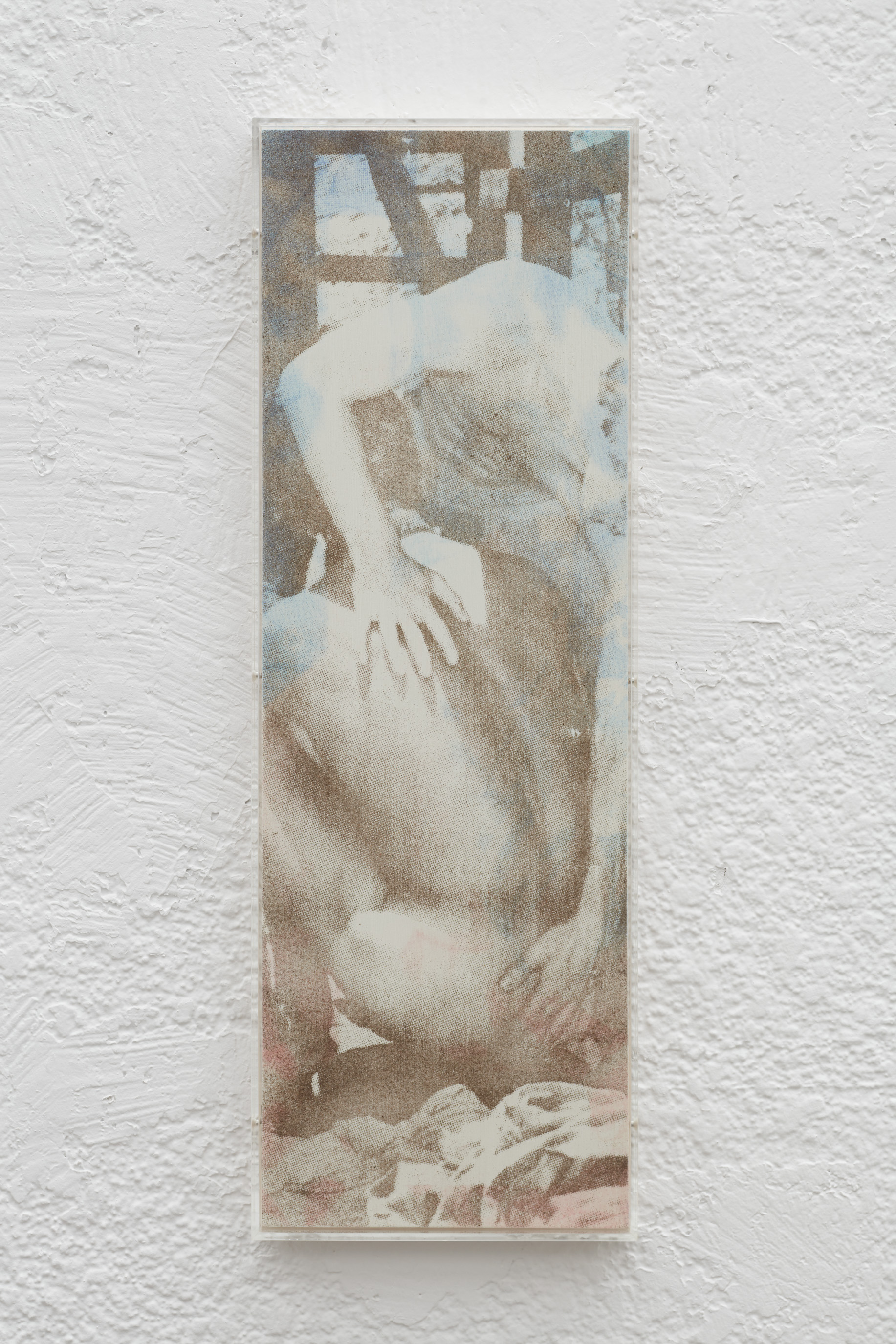 Louis Blue Newby, Untitled (Dust Painting), 2025. Crisco, dust, UV print and oil paint on wooden panel in perspex frame, 24 x 8.25 in. (61 x 21 cm).