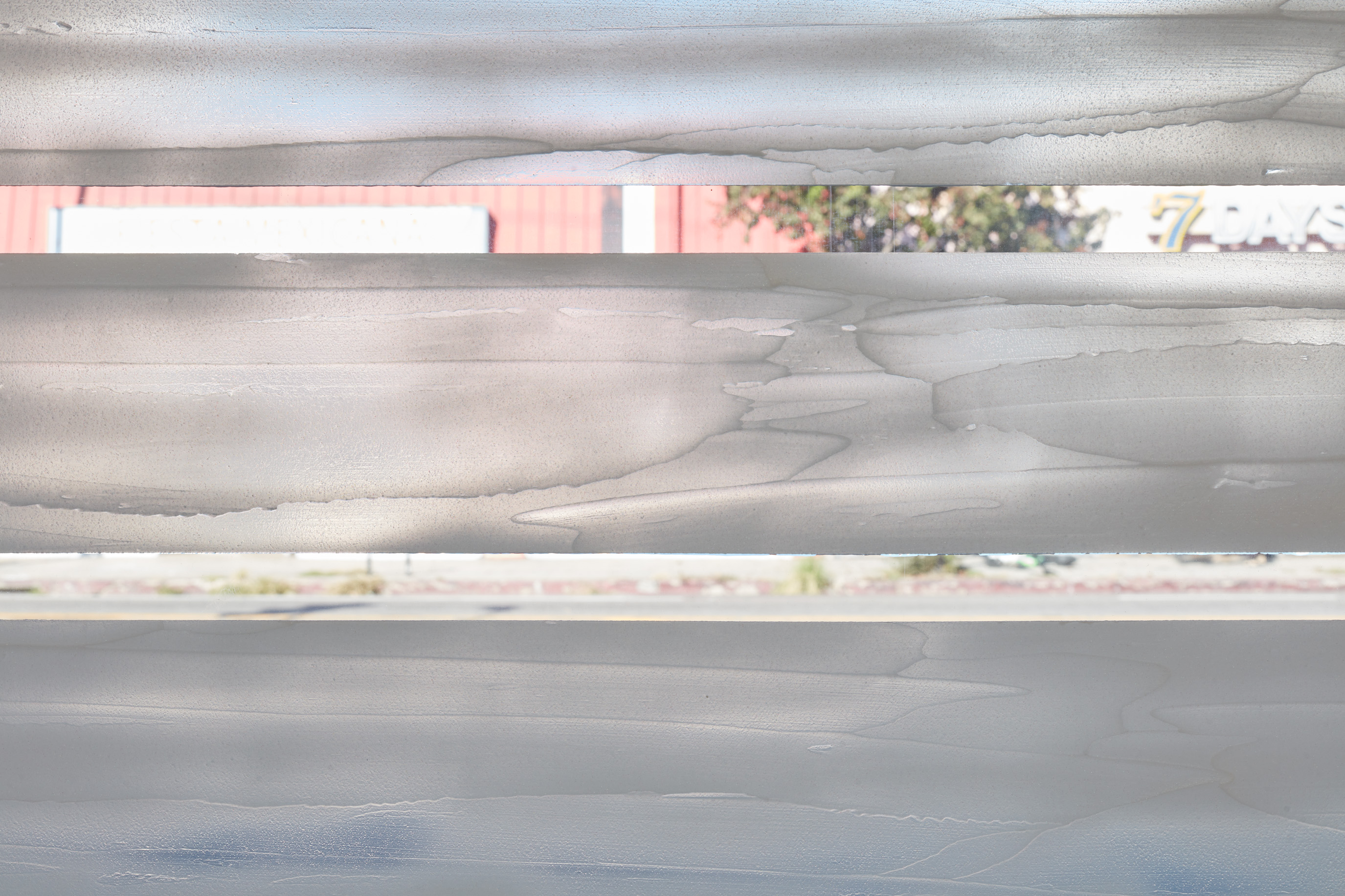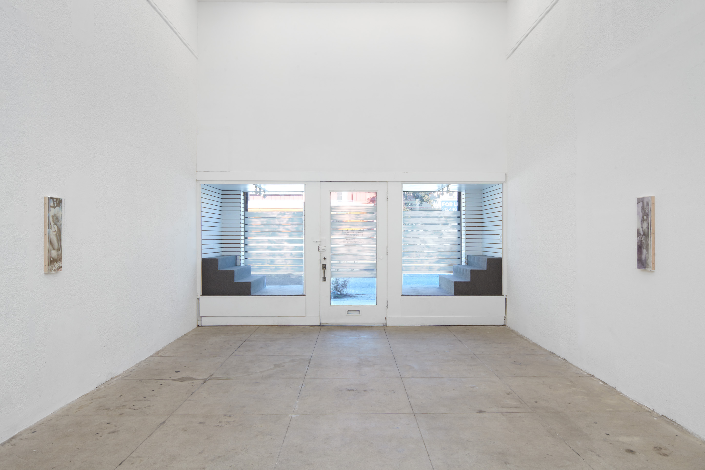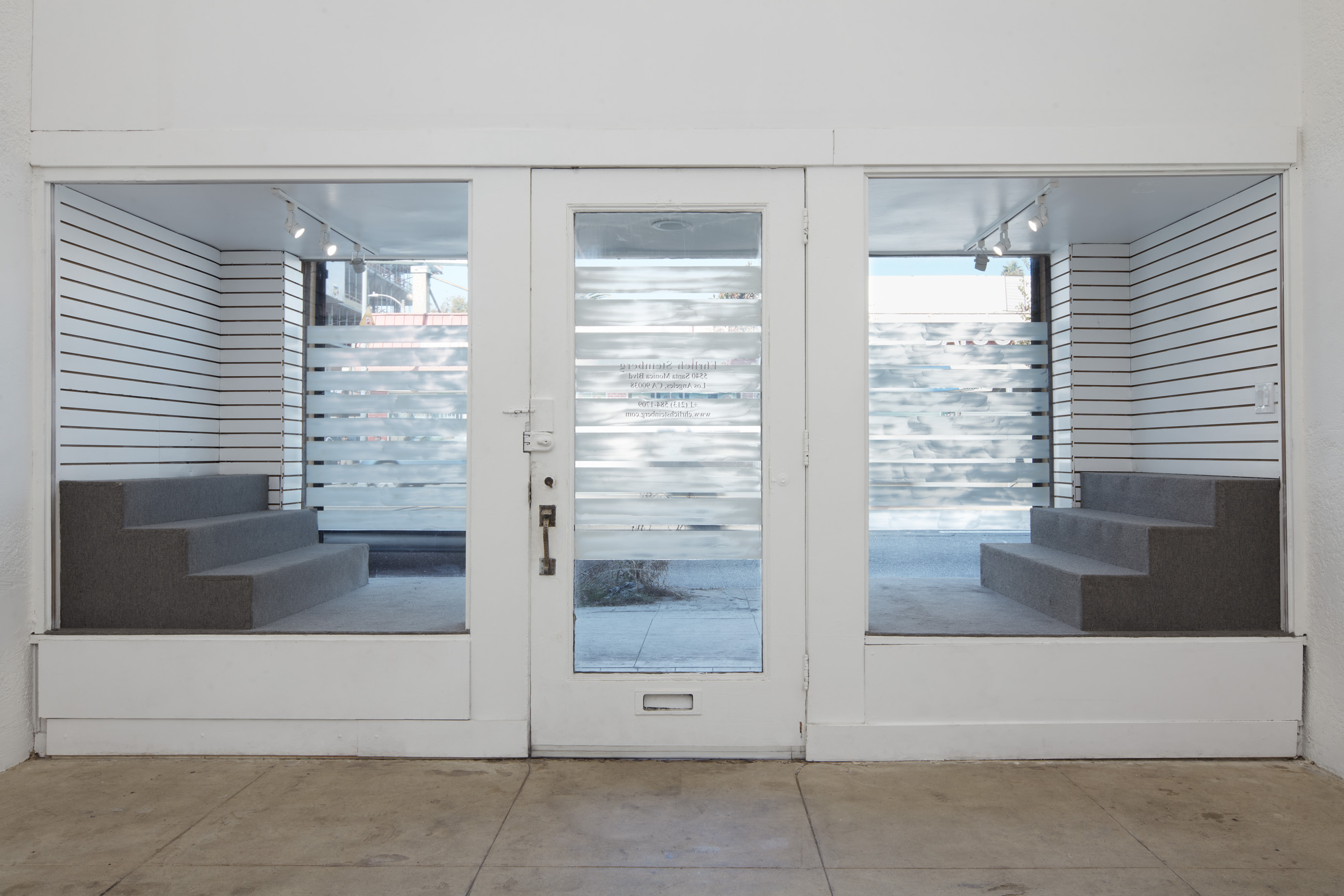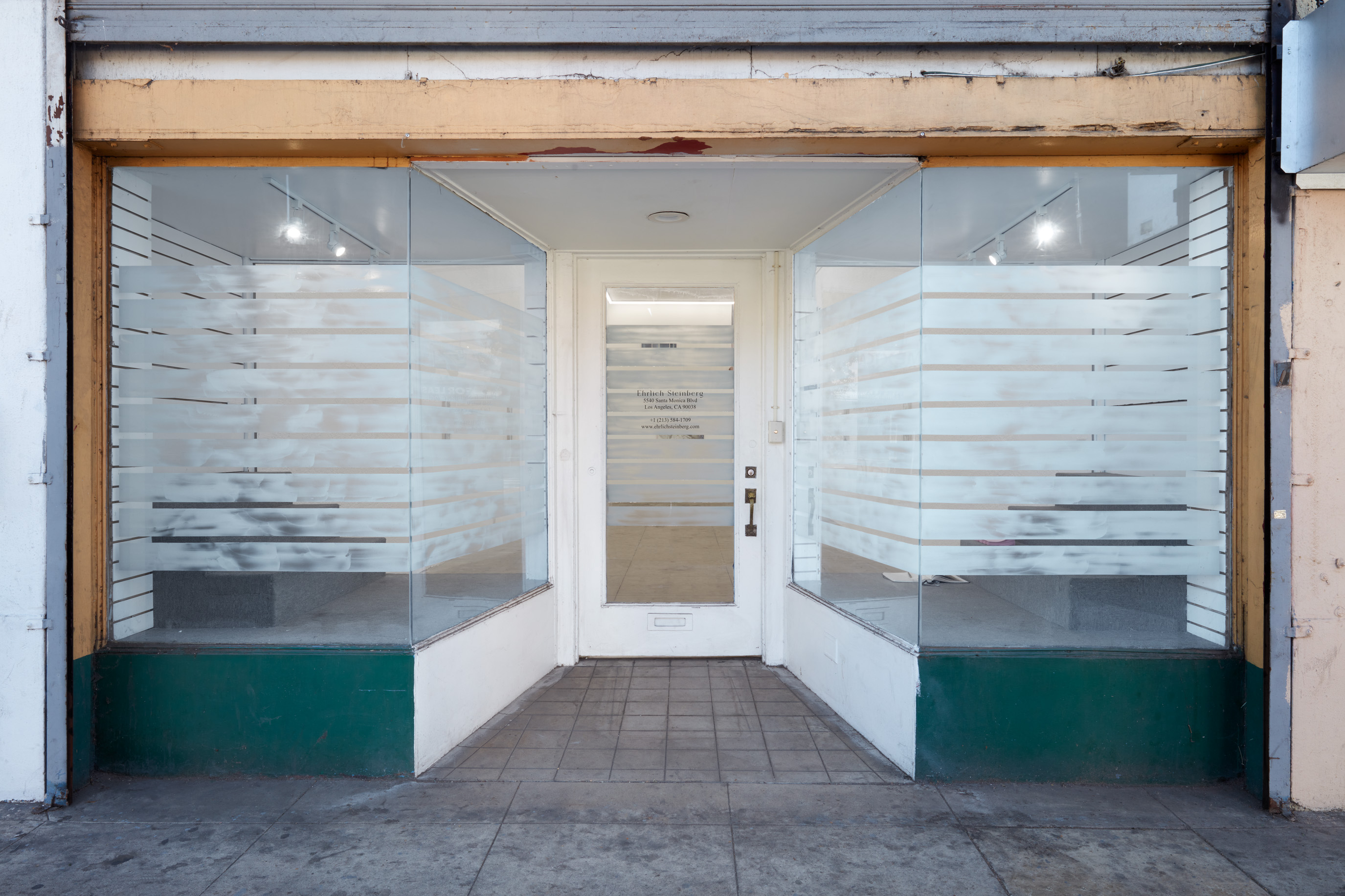 On the gallery’s front windows, the artist has installed a ‘privacy screen’ composed of glitter and Crisco—a brand of vegetable fat historically used as a lubricant within gay male sexual subcultures. Functioning as a threshold between the private space of the gallery and the public space of the street, the work both obscures the view of the interior while granting privacy to those inside.