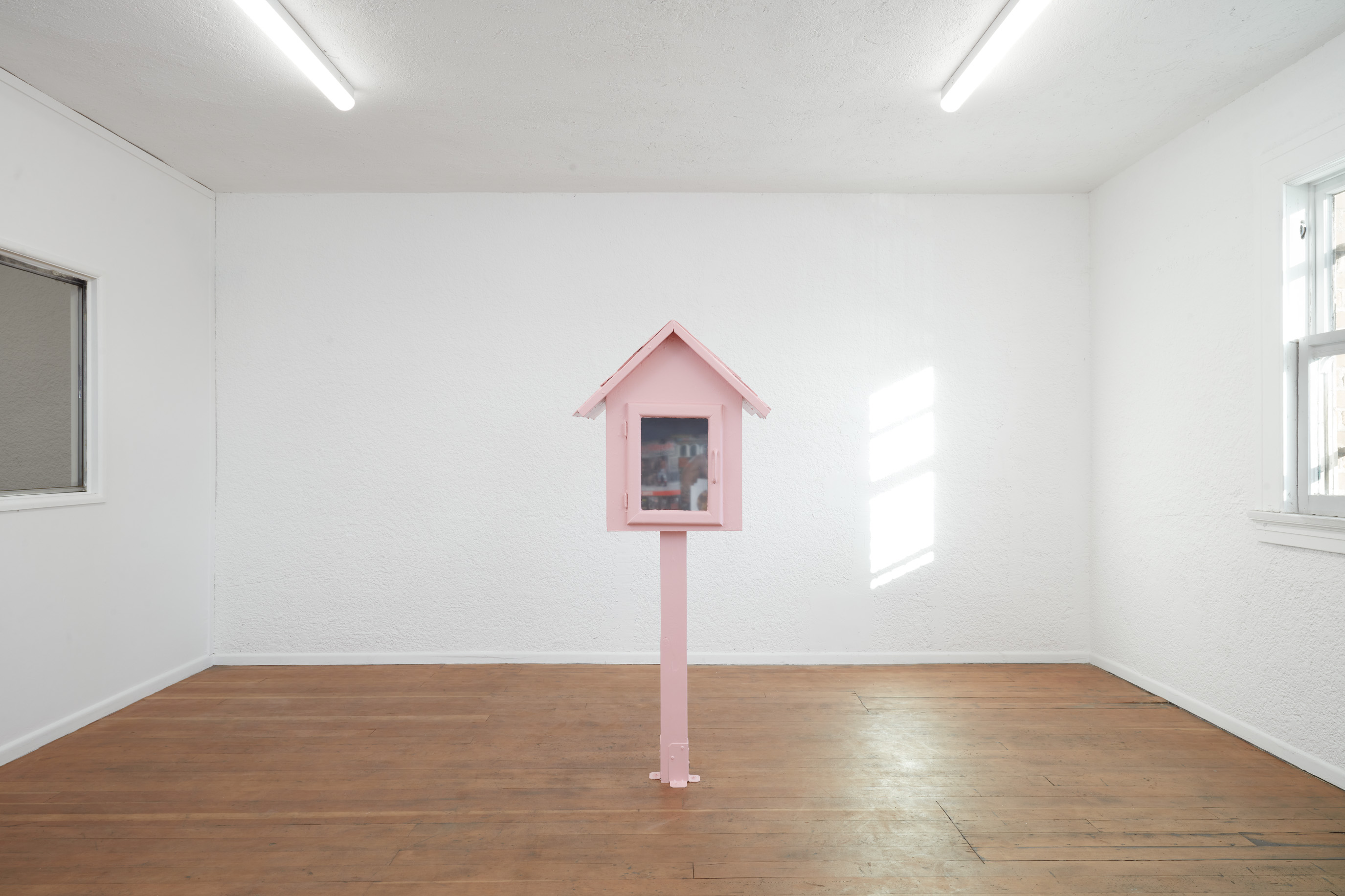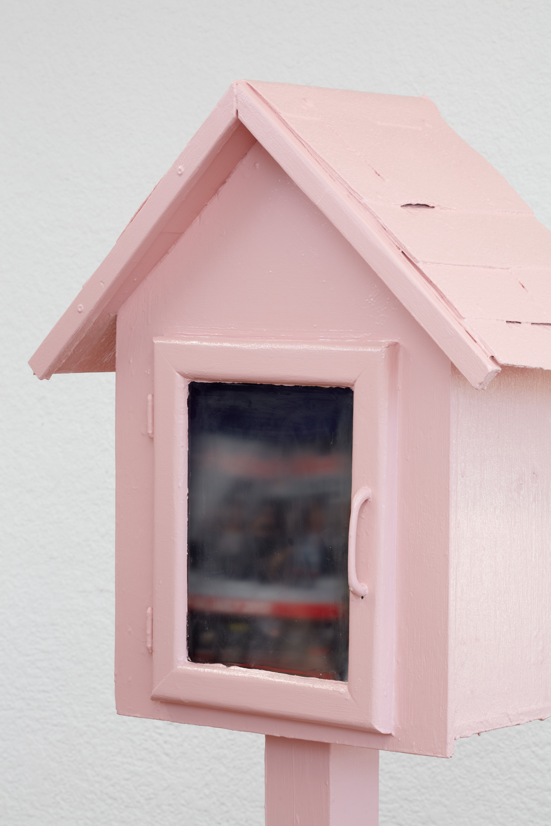 In the sculpture upstairs, a found community library box houses a collection of pornographic literature. Painted shut with layers of designer gloss paint, the work transforms a symbol of civic openness into a sealed vessel of longing and fantasy. Together with the gallery’s Crisco-smeared windows at the entrance, the sculpture bookends the exhibition’s recurring ideas of privacy, exposure, and denial. Here, the intimacy of looking becomes inseparable from what is hidden or not seen.