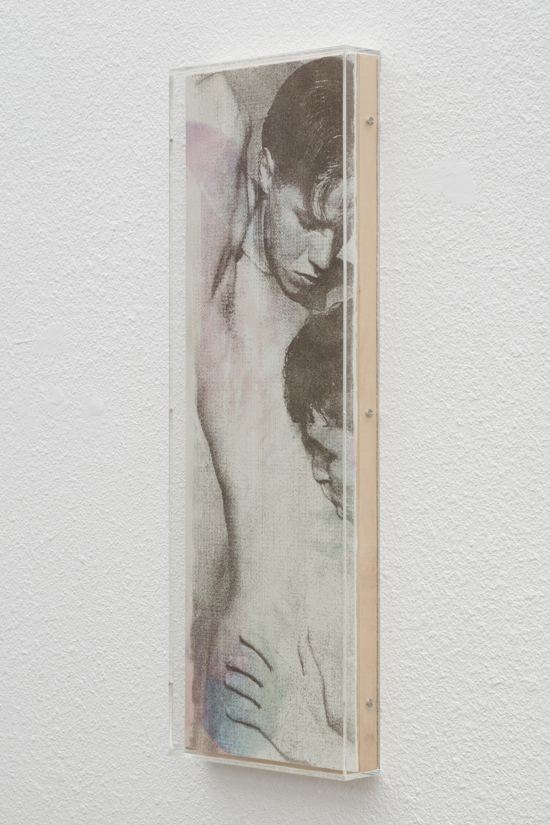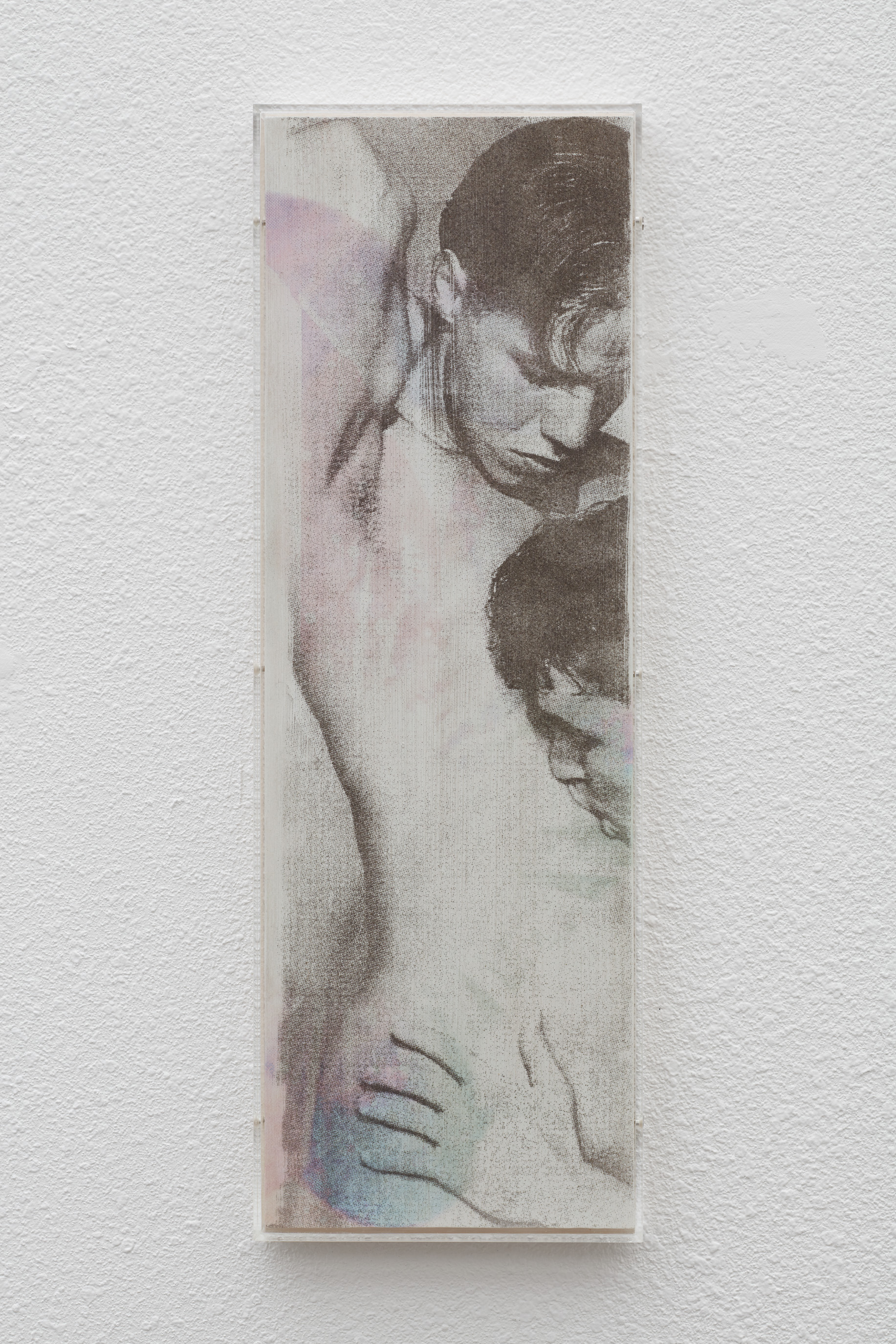 The artist’s exhibiting ‘dust paintings’ are composed through intricate layers of found pornographic imagery sourced online and from out-of-print magazines. Painted wooden panels are coated in jewel-toned colors using UV printing, then screen printed with Crisco and finely ground dust collected by the artist from domestic spaces. Encased in plexiglass, the works underscore the tension between bodily and archival vulnerability within the controlled aesthetics of display.